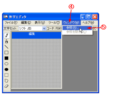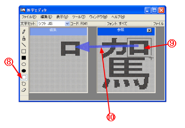 H 外字に必要な部分を選択る。 I [編集]ウィンドウにドラッグする。 以上の操作を繰り返して、既存の文字から外字を作成します。