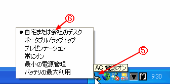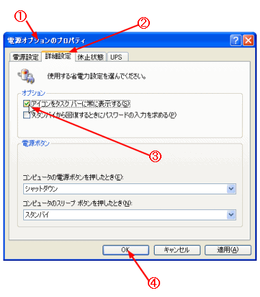 タスクバーに画面設定インジケータを表示します。 @ コントロール パネルの[電源オプション]を開く。 A [詳細設定]タブをクリックする。 B [アイコンをタスクバーに常に表示する]をチェックする。 C [OK]ボタンをクリックする。 |