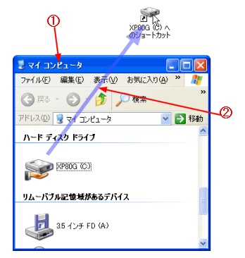 @ [マイ コンピュータ]を開くする。 A ディスクアイコンをデスクトップまでドラッグする。