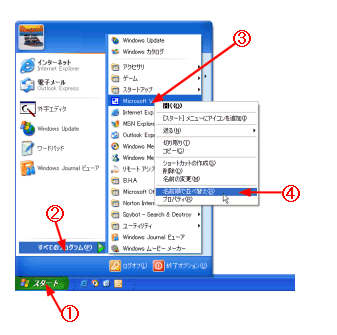 @ [スタート]ボタンをクリックする。 A [プログラム]をポイントする。 B メニュー項目を右クリックする。