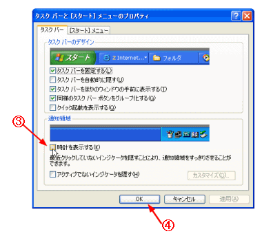 B [時計を表示する]ボックスのチェックを解除する。 C [OK]ボタンをクリックする。 |