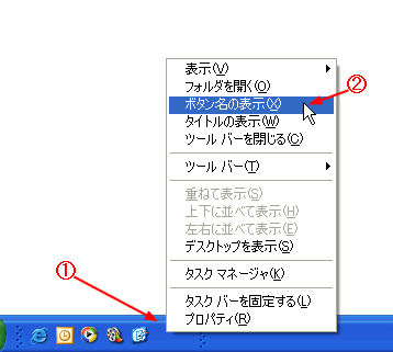 タスクバーに各種ツールバーを表示して操作しやすくします。この設定をする前に、タスクバーの固定を解除する を実行してください。 @ ツールバーを右クリックする。 A [ボタン名の表示]をクリックする。