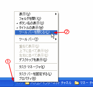 使わなくなったツールバーを閉じます。この設定をする前に、タスクバーの固定を解除する を実行してください。 @ ツールバーの左端を右クリックする。 A [ツールバーを閉じる]をクリックする。