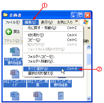 フォルダ内にあるすべてのファイルを選択します。 @ [編集]メニューをクリックする。 A [すべて選択]をクリックする。 [Ctrl]を押しながら[A]を押してもすべてのファイルを選択できます。 |