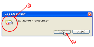B このアイコンはごみ箱に入れないで、削除と同時に消去することを表している。 C よく確認してから[はい]ボタンをクリックする。