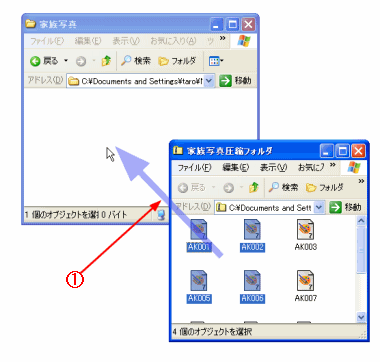 @ 解凍したいファイルを圧縮フォルダから通常のフォルダまでドラッグ&ドロップする。 ファイルを通常のフォルダへドラッグ&ドロップしても、元のファイルは移動しません。
