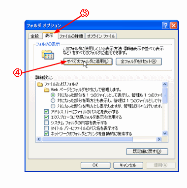 B [表示]タブをクリックする。 C [すべてのフォルダに適用]ボタンをクリックする。 |