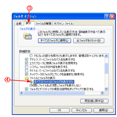 B [表示]タブをクリックする。 C [すべてのファイルとフォルダを表示する]をクリックする。