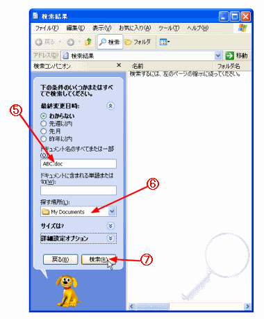 D ドキュメント名のすべてまたは一部を入力する。 E 探す場所を指定する。 F [検索]ボタンをクリックする。 |