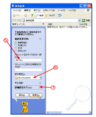 D ドキュメント名のすべてまたは一部を入力する。 E 探す場所を指定する。 F [詳細設定オプション]ボタンをクリックする。 |