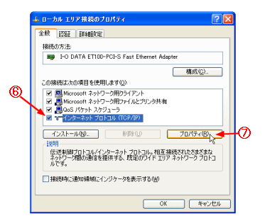 E [インターネットプロトコル]をクリックする。 F [プロパティ]ボタンをクリックする。 |