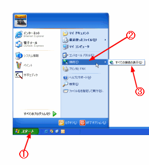 @ [スタート]ボタンをクリックするく。 A [接続]をポイントする。 B [すべての接続の表示]をクリックする。