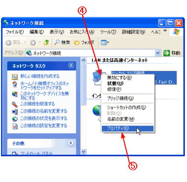 C 設定しているLANカードを右クリックする。 D [プロパティ]をクリックする。 |