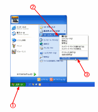 @ [スタート]ボタンをクリックするく。 A [マイコンピュータ]を右クリックする。 B [プロパティ]をクリックする。