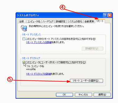 C [リモート]タブをクリックする。 D [リモートユーザーの選択]ボタンをクリックする。 |