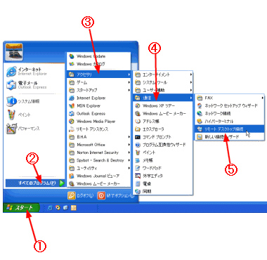 B [アクセサリ]を ポイントする。 C [通信]をポイントする。 D [リモートデスクトップ接続]をクリックする。