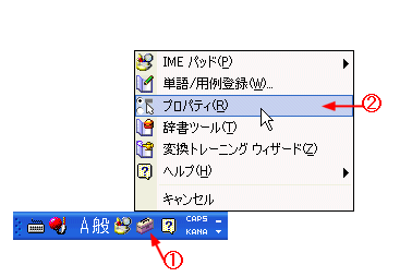 以下の設定をすると、ローマ字入力中に[Shift]キーを1回押すだけで英字が直接入力できるようになります。もう1回押すと、再びローマ字入力ができるようになります。 @ 言語バーの[ツール]ボタンをクリックする。 A [プロパティ]ボタンをクリックする。 |