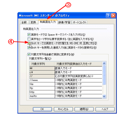 C [Shiftキーでの英数モード切り替えをMS-IME 95互換とする]をチェックする。