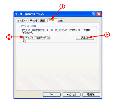 マウスを操作する場所がなくても、テンキーで代用できます。なお、クリック操作はテンキーの[5]で行います。 まず、コントロール パネルの[ユーザー補助のオプション]をダブルクリックしてから、次の操作をします。 @ [マウス]タブをクリックする。 A [マウス機能を使う]をチェックする。 B [設定]ボタンをクリックする。 |