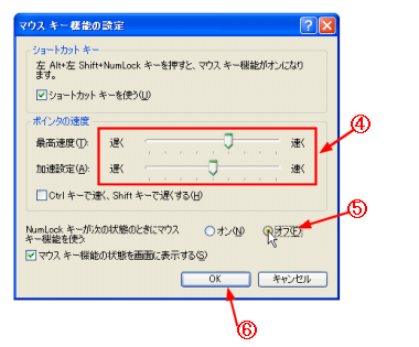 C ポインタの移動速度を調整する。 D ここをオフに設定すると、[NumLock]キーがオンのときは、データ入力ができて、オフのときはマウス操作ができるようになる。 E [OK]ボタンをクリックする。 |