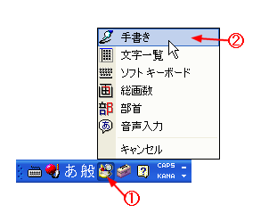 読みの分からない漢字や記号も手書きで調べることができます。 @ 言語バーの[IMEパッド]ボタンをクリックする。 A [手書き]を クリックする。 |