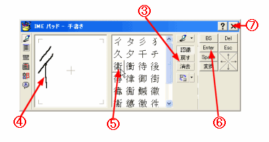 B すでに文字が書かれている場合は、[消去]ボタンをクリックする。 C マウスで文字を描く。 D該当する文字をクリックする。 E [Enter]ボタンをクリックすると入力される。 F [閉じる]ボタンをクリックする。 |