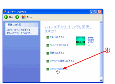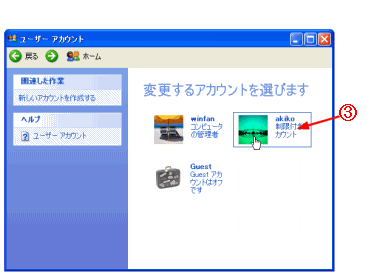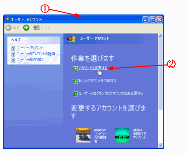 @ コントロール パネルの[ユーザーアカウント]を開く。 A [アカウントを変更する]をクリックする。
