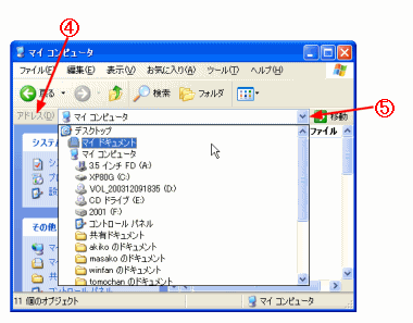 C アドレスバーが表示された。 D リストからドライブやフォルダを選択し、移動できる。 |