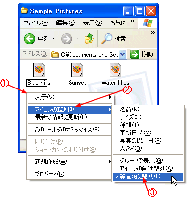 @ ウィンドウ内を右クリックする。 A [アイコンの整列]をポイントする。