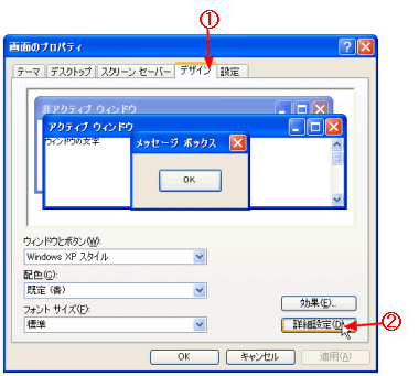目が疲れないようにウィンドウ内の背景色を変更します。 デスクトップを右クリックして[プロパティ]をクリックしてから、以下の操作をしてください。 @ [デザイン]タブウィンドウをクリックする。 A [詳細設定]ボックスをクリックする。
