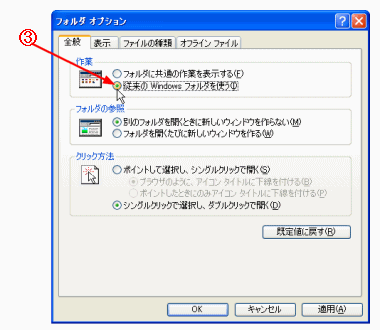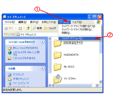 Windows XPではウィンドウの左側にタスク欄が表示されますが、従来のWindowsのようにタスク欄を表示しないように設定します。 @ フォルダを開き[ツール]メニューをクリックする。 A [フォルダオプション]をクリックする。